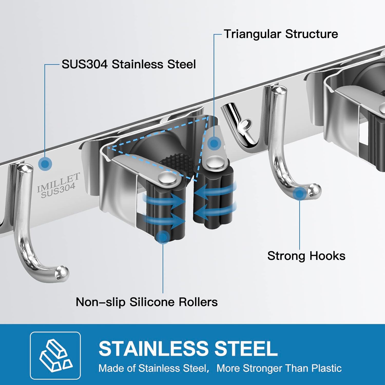 - STRONG & STURDY: Broom organizer wall mount is made of 304 stainless steel, corrosion-resistant, moisture proof and waterproof. Compared with the plastic broom rack, it's more stronger and sturdy. And this garage organization can hold up to 200 pounds when install it by screws drilling,the hook also can hold your steam mop