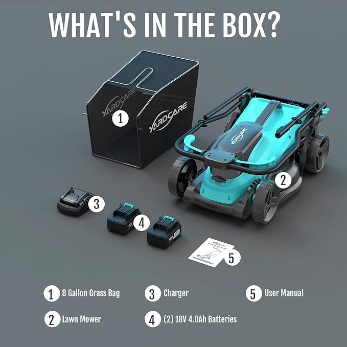 - 【All-Inclusive Package & Ready to Use】 Comes with everything you need: YARDCARE cordless lawn mower, 8-gallon grass bag, (2) 18V 4.0Ah batteries, charger, and user manual. Skip the trip to the store—unbox, charge, and start mowing in minutes.